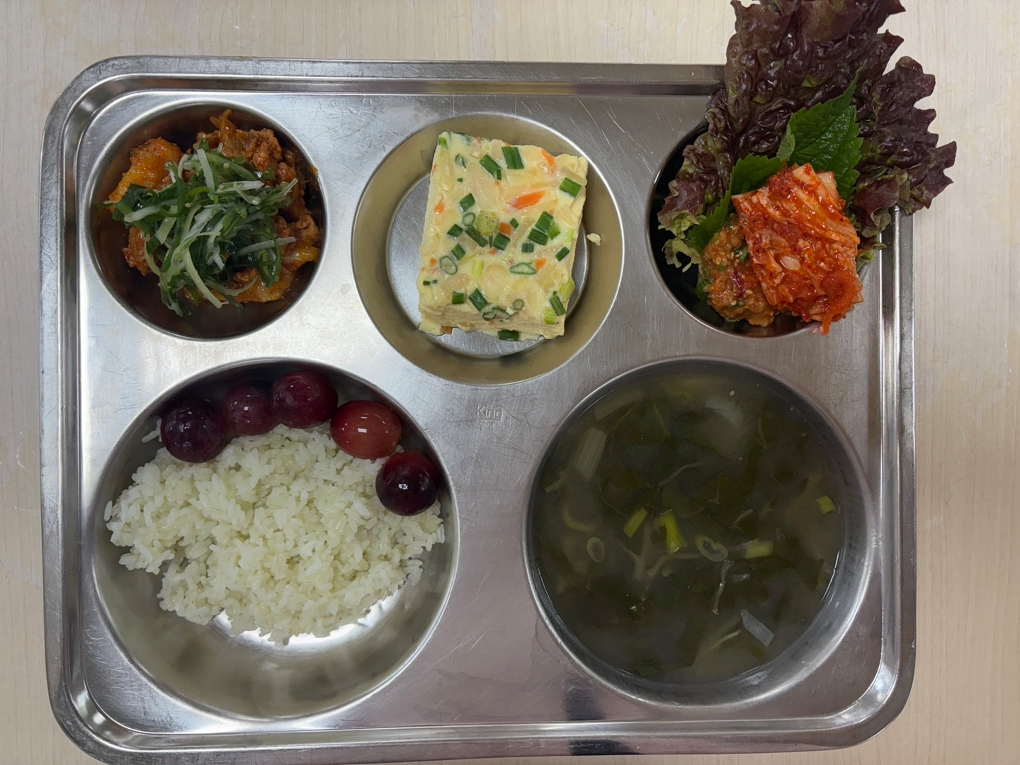 클로렐라밥근대된장국(5.6.9.18)파채고추장불고기(5.6.10.13)야채달걀찜(1.2.9)배추김치(자율)(9)모듬쌈/쌈장(자율)(5.6.13)씨없는포도* 에너지/단백질/칼슘/철664.4/39.2/202.5/3.6