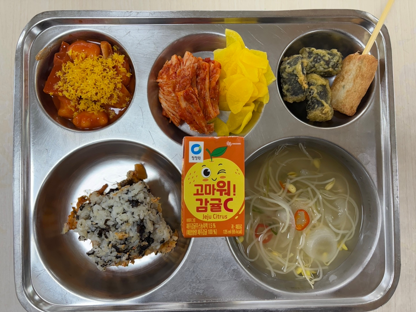 다채롭데이밥버거(1.5.9.13.16.18)별가루떡볶이(1.2.5.6.13)미니어묵바(1.5.6)김말이(1.2.5.6.10.15.16.18)꼬들단무지홍초콩나물국(자율)(5.6.9.18)배추김치(자율)(9)감귤쥬스(13)* 에너지/단백질/칼슘/철829.3/21.5/160.4/5.2