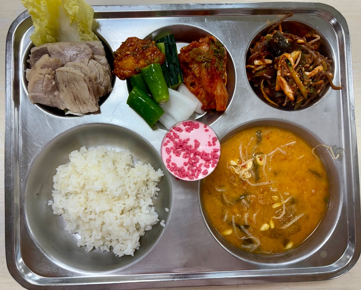 찹쌀밥콩비지찌개(5.6.9.10.18)돼지고기수육/쌈장(5.6.10.13)메밀막국수(3.5.6.13)배추김치(자율)(9)알배추쌈,야채스틱(자율)(5.6.13)크림치즈케이크(1.2.5.6)* 에너지/단백질/칼슘/철824.7/46.0/193.8/4.2