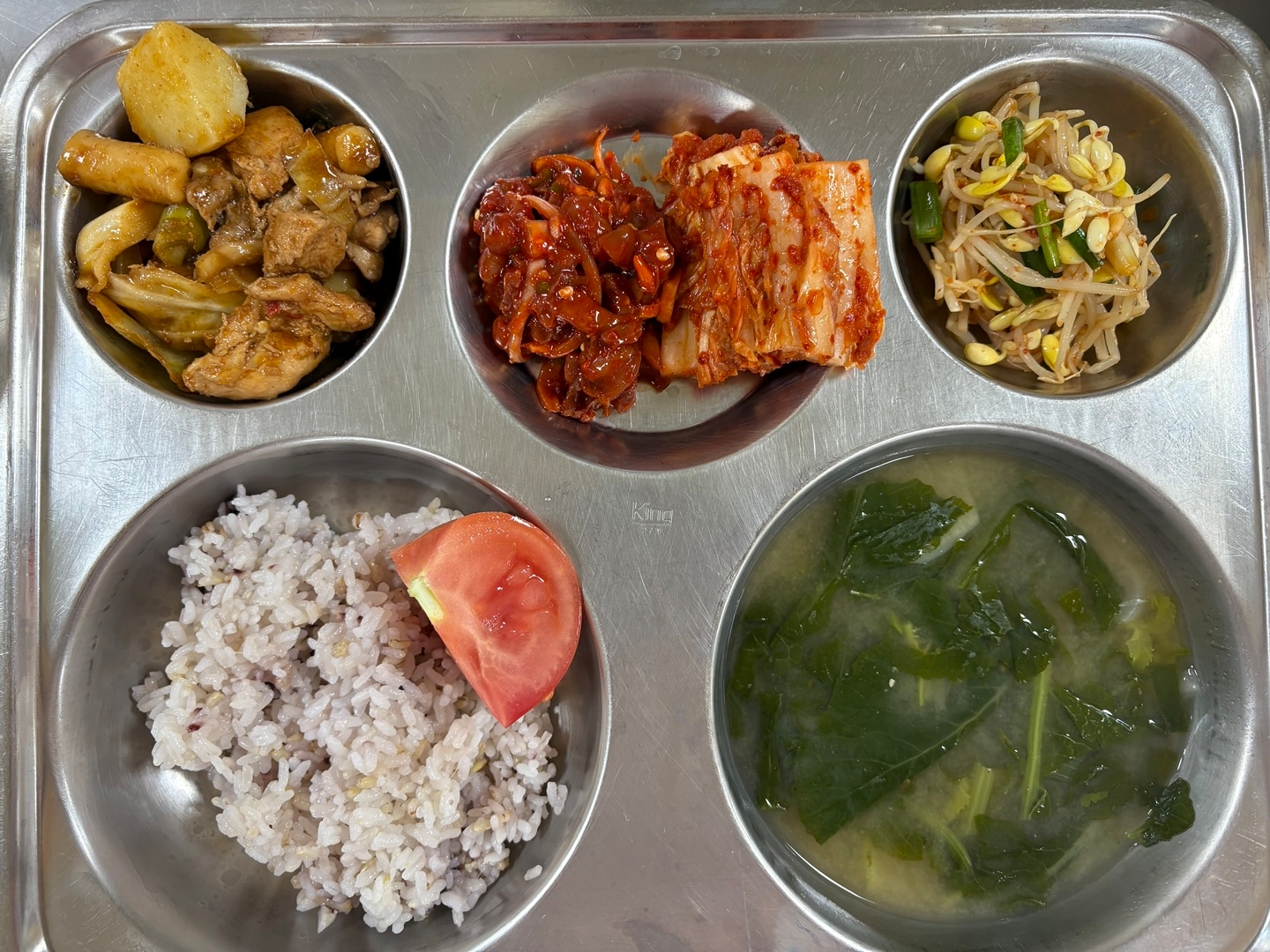 혼합잡곡밥(5)열무된장국(5.6.9.18)블랙스파이시짜파찜닭(2.5.6.13.15)매콤콩나물무침(5.6)오징어젓갈무침(자율)(17)배추김치(자율)(9)꿀토마토(12.13)* 에너지/단백질/칼슘/철800.4/36.9/253.2/3.2