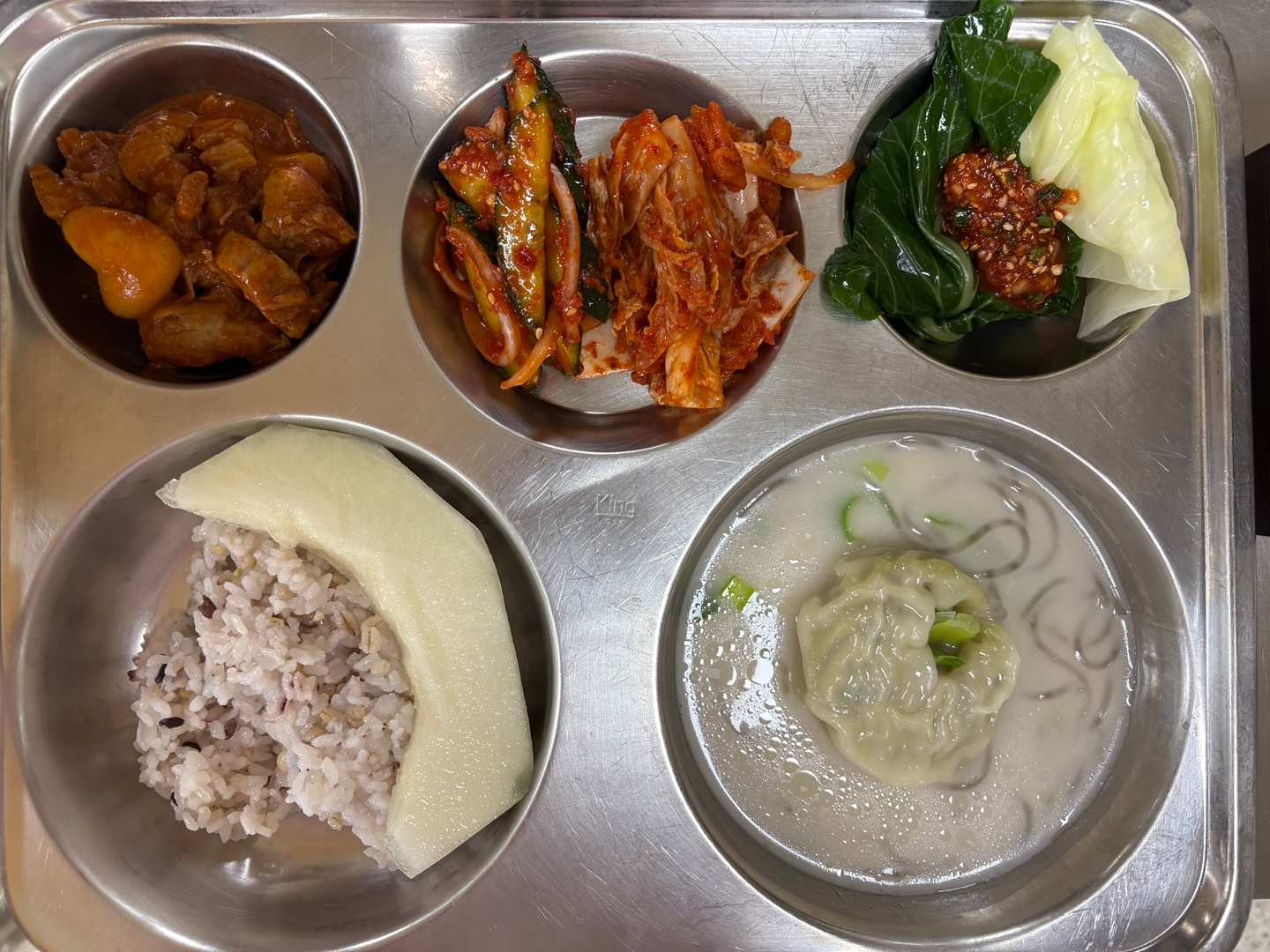 혼합잡곡밥(5)사골만둣국(1.5.6.10.13.16.18)매운바비큐폭찹(2.5.6.10.12.13)오이양파무침(13)배추김치(자율)(9)양배추,케일쌈/양념장(자율)(5.6)골든듀멜론* 에너지/단백질/칼슘/철708.6/37.2/115.6/4.7