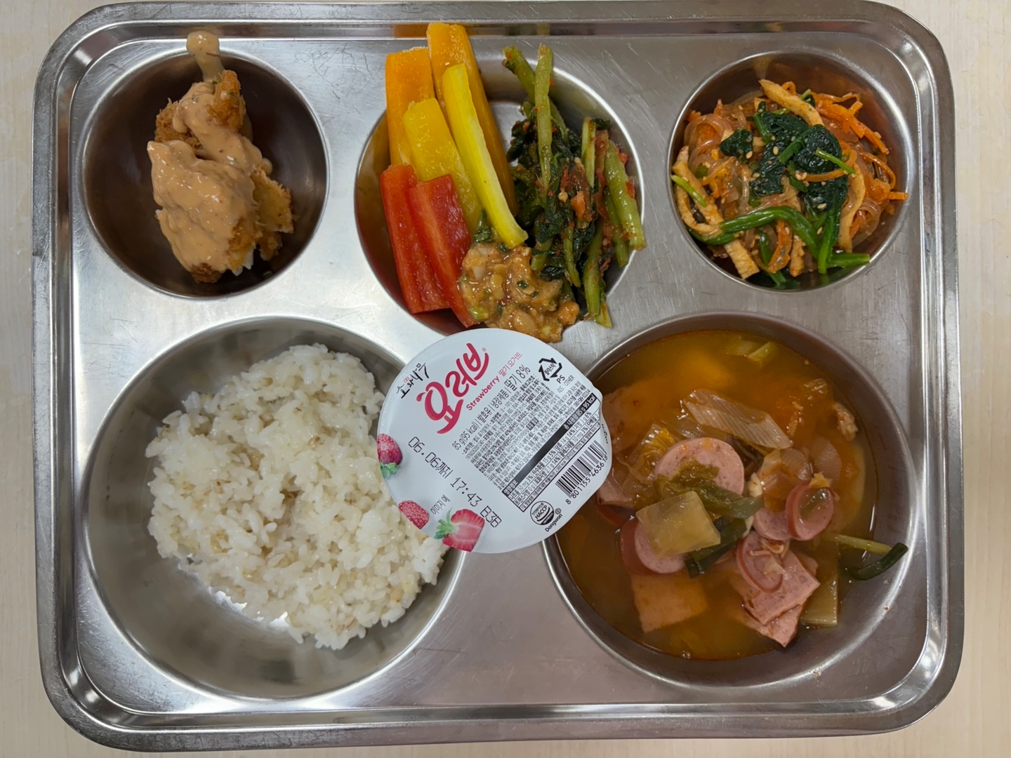 찰보리밥부대찌개(1.2.5.6.9.10.13.15.16)가자미치폴레(1.2.5.6.13)부산식비빔당면(1.5.6.13)총각김치(자율)(9)딸기요플레(2)파프리카스틱/쌈장(자율)(5.6.13)* 에너지/단백질/칼슘/철874.8/31.7/267.5/3.1