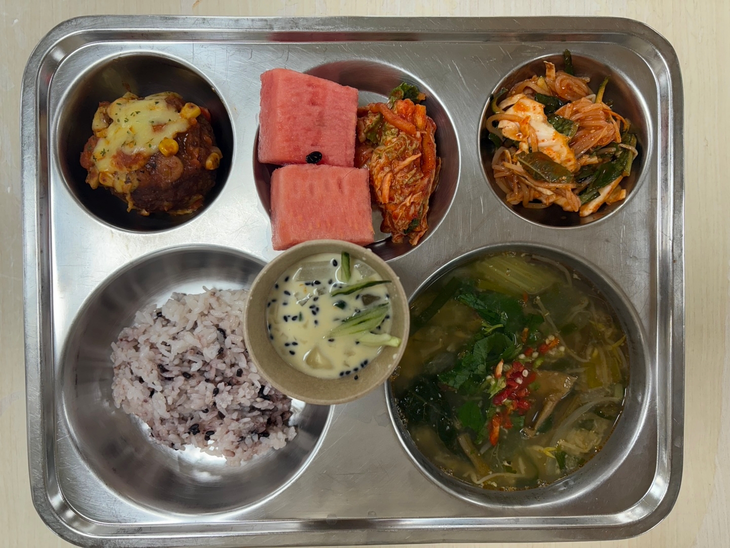찰흑미밥장어국(5.6.13)피자맛밤함박(1.2.5.6.10.12.13.15.16)쫄면야채무침(5.6.13)배추김치(자율)(9)우묵콩국(자율)(4.5)수박* 에너지/단백질/칼슘/철809.7/28.0/207.6/3.4