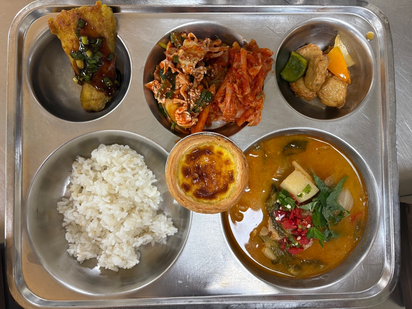 찰현미밥묵은지감자탕(5.6.9.10.13)순살삼치카레구이(2.5.6.12.13.16.18)볼어묵야채볶음(1.5.6.13)골뱅이참나물무침(자율)(5.6.13)수제에그타르트(1.2.5.6)배추김치(자율)(9)* 에너지/단백질/칼슘/철756.2/32.8/190.9/2.6