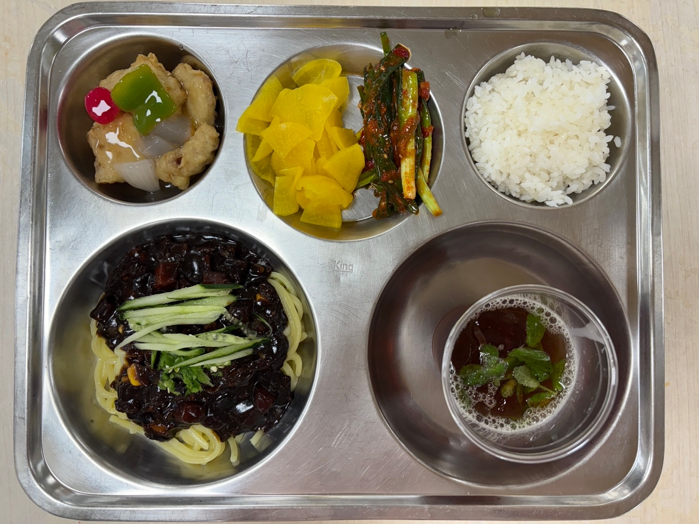 자장면(1.5.6.10.13.16)꿔바로우탕수육(1.5.6.10.11.12.13.18)쪽파김치(자율)(13)찹쌀밥(자율)꼬들단무지복숭아아이스티(컵)(11.13)* 에너지/단백질/칼슘/철910.5/29.6/226.6/2.0