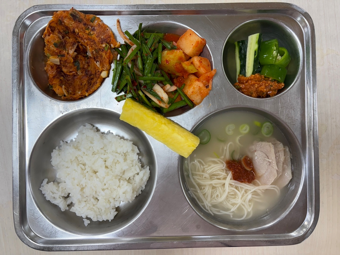 찹쌀밥구산돼지국밥(소면사리)(5.6.9.10.13)오징어김치전(1.5.6.9.17.18)부추양파겉절이(5.6.13)깍두기(9)골든파인애플모듬야채스틱/쌈장(자율)(5.6.13)* 에너지/단백질/칼슘/철764.2/42.9/138.7/3.1