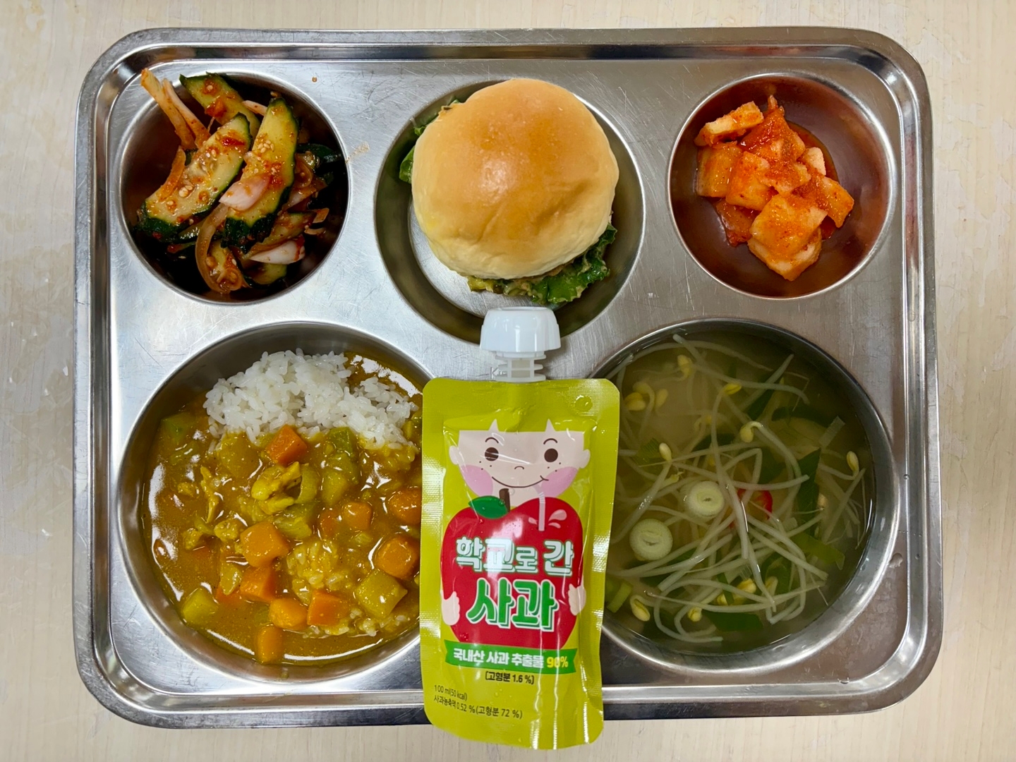 단호박카레라이스(2.5.6.10.12.13.16.18)홍초콩나물국(5.6.9.18)수제미니햄버거(1.2.5.6.10.12.13.15.16)오이양파무침(자율)(13)깍두기(9)사과주스(13)* 에너지/단백질/칼슘/철843.1/28.7/210.1/6.3