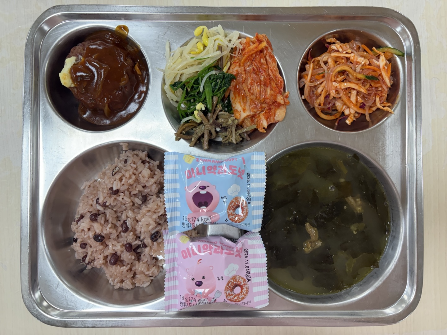 찹쌀팥밥한우미역국(5.6.9.16.18)치즈함박스테이크(1.2.5.6.10.12.13.15.16)실곤약야채무침(5.6.13)배추김치(자율)(9)미니약과도넛(1.2.5.6)삼색나물(콩시고)(5)* 에너지/단백질/칼슘/철772.4/24.3/194.5/3.0