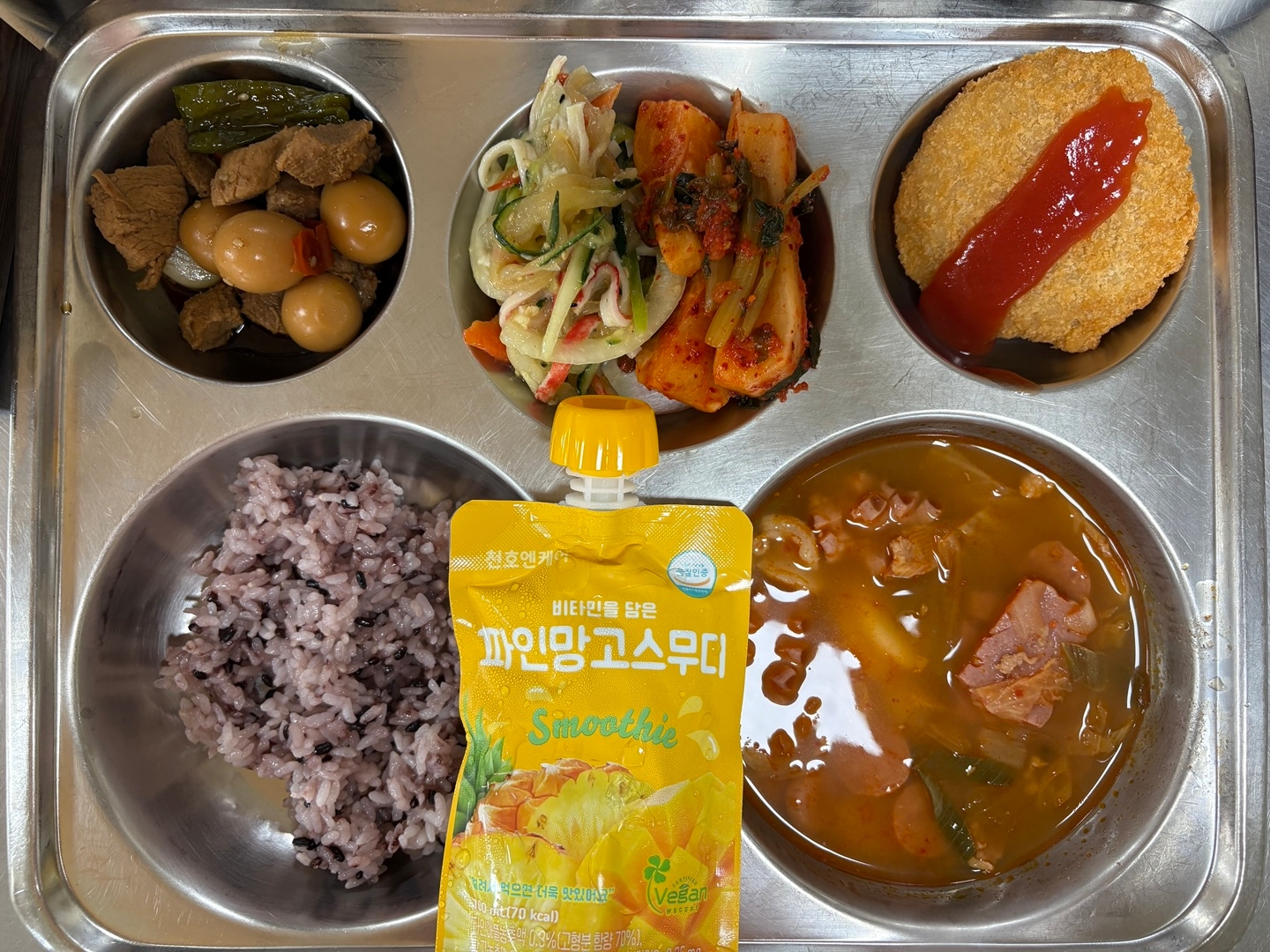 찰흑미밥부대찌개(1.2.5.6.9.10.13.15.16)돈안심메추리알조림(1.5.6.10.12.13)햄에그카츠/케첩(1.2.5.6.10.12.15.16)해파리겨자냉채(자율)(1.5.6.8.13)총각김치(자율)(9)망고스무디(13)* 에너지/단백질/칼슘/철916.0/49.6/228.3/5.2