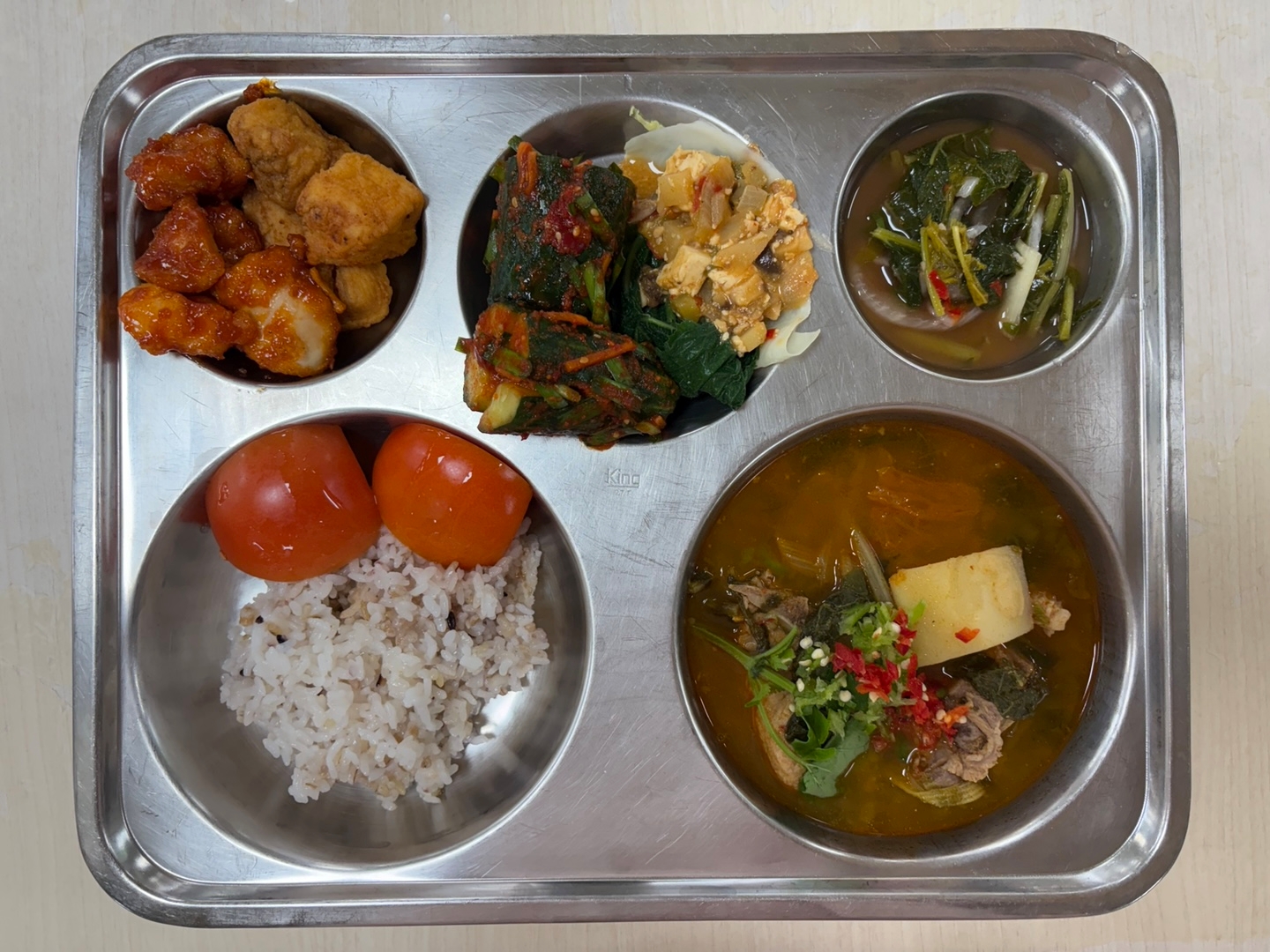 혼합잡곡밥(5)등뼈감자탕(5.6.9.10.13)반반치킨(2.4.5.6.12.13.14.15.19)오이소박이(5.6.9.13)꿀토마토(12.13)호박잎,양배추쌈/우렁강된장(자율)(5.6)수제열무물김치(자율)(13)* 에너지/단백질/칼슘/철839.1/42.6/167.1/3.0