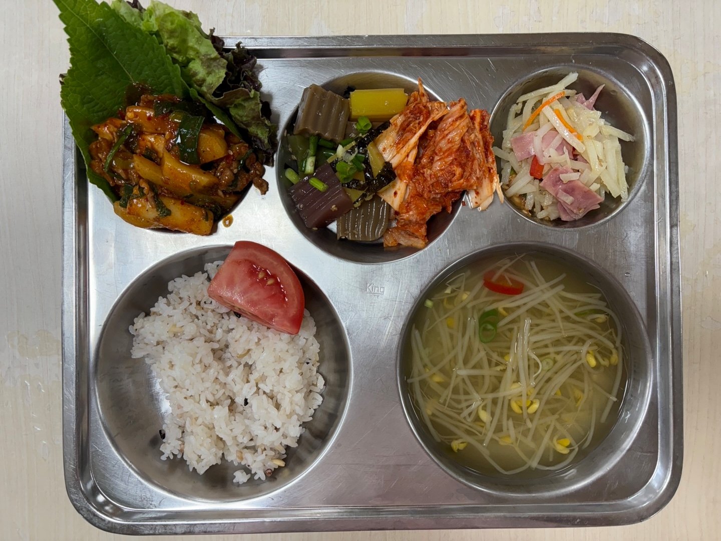혼합잡곡밥(5)홍초콩나물국(5.6.9.18)무항생제오리불고기(5.6.13)베이컨감자채볶음(10)배추김치(자율)(9)삼색묵무침(자율)(5.6)꿀토마토(12.13)모듬쌈/쌈장(자율)(5.6.13)* 에너지/단백질/칼슘/철884.5/31.4/175.4/4.2