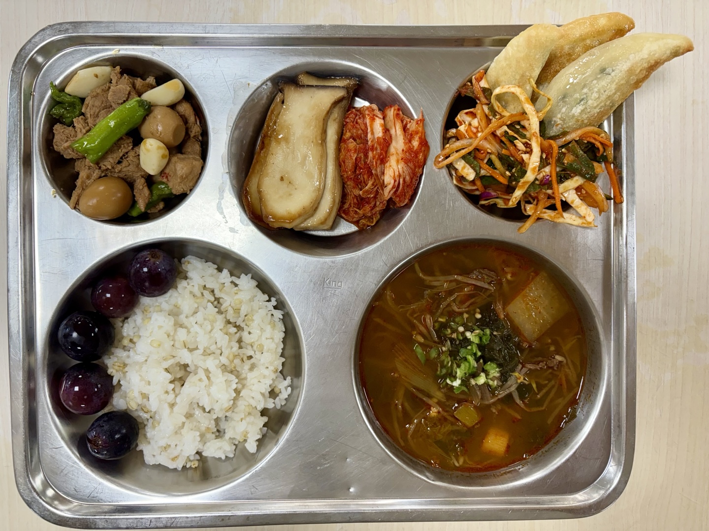 찰보리밥육개장(5.6.9.16.18)돈안심메추리알조림(1.5.6.10.12.13)매콤비빔만두(1.5.6.10.13.15.16.18)새송이버섯구이(자율)배추김치(자율)(9)거봉* 에너지/단백질/칼슘/철693.3/38.6/166.3/3.6